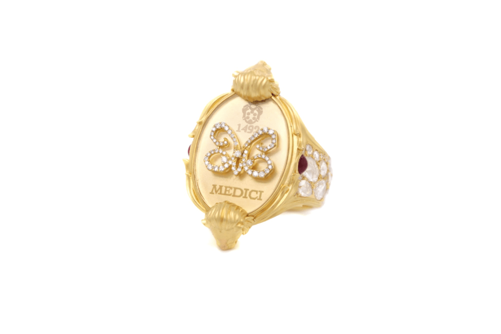 Two standout pieces at the event were the dreamy butterfly brooch “Winter Sky” and the Medici logo men’s ring, both of which were admired by all guests. These pieces received high praise from Prince Lorenzo, the head of the Medici family.
